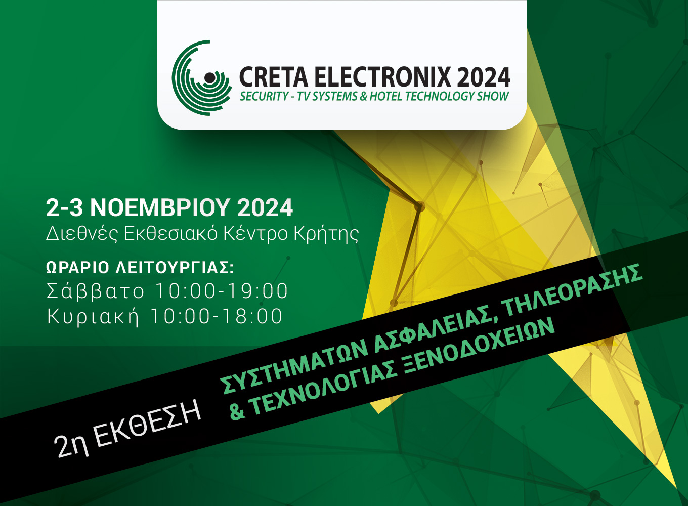 Η 2η κλαδική έκθεση συστημάτων ασφαλείας, τηλεόρασης, δικτύων και τεχνολογίας ξενοδοχείων,Creta Electronix 2024, επιστρέφει δυναμικά στο Διεθνές Εκθεσιακό Κέντρο Κρήτης στο Ηράκλειο στις 2 και 3 Νοεμβρίου 2024!